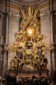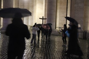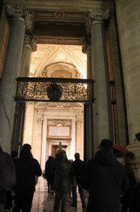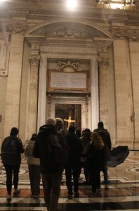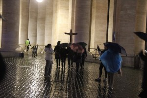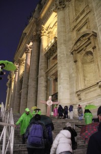 Le dimanche soir précédant la messe de clôture, nous avons la chance de faire une dernière fois la démarche jubilaire depuis la Piazza Pia, d’où partait le « corridor » destiné aux pèlerins. Derrière une grande croix portée par un pèlerin, dans la nuit tombante, en priant, accompagnés par des bénévoles « petits hommes verts » (de l’espérance, bien sûr !) ; passant par la Porte Sainte qui sera refermée dans quelques heures et pour 7 ans (la prochaine Année Sainte est prévue en 2033, pour les 2000 ans de la mort et de la résurrection du Christ) ; dans la basilique, accueillis devant la Confession par un bénévole qui nous rappelle ce qu’est cet endroit et récite avec nous le Credo. Impressionnant !