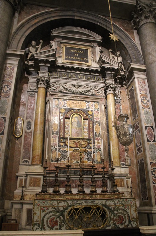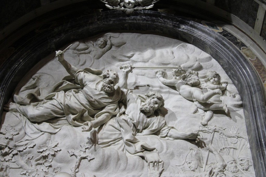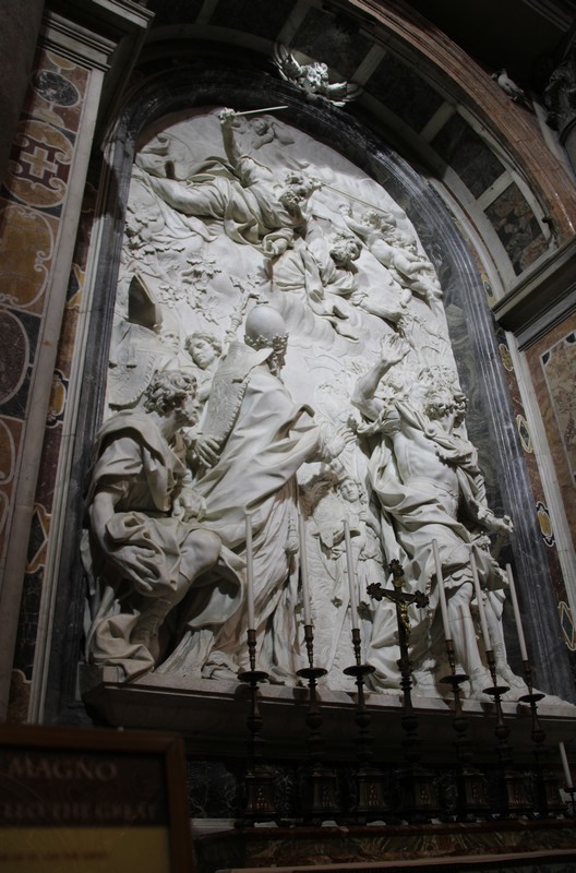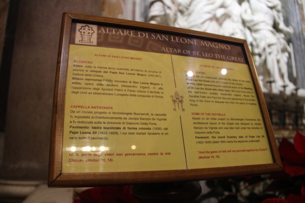Dans cette même chapelle, se trouve un haut-relief signé par l’Algarde, et qui représente saint Pierre et saint Paul qui assistent le pape Léon le Grand (440-461) en discussion avec Attila : par sa parole puissante, le Pape obtiendra qu’Attila ne détruise pas Rome !